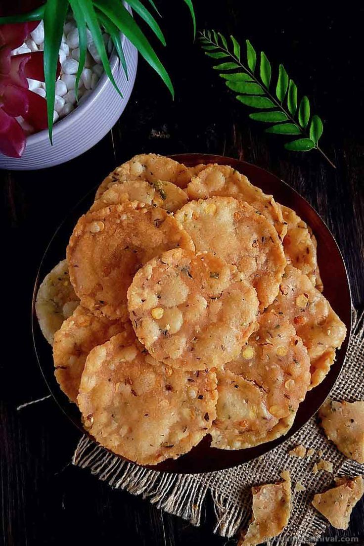 Crispy Andhra-style rice crackers made with green chillies, curry leaves, and chana dal — a spicy, crunchy treat for all ages.